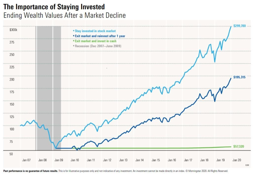 We have also provided for your reference below analysis provided by Morningstar, another well respected investment research house that have shown the differing impact of “staying invested”, “going to cash and statying there” and “going to cash and attempting to get back into the market – 1 year later”. This is just one illustration of much analyses that demonstrate that “staying invested” as part of a well crafted, heavily diversified portfolio with adequate orienation to defensive assets is the preferred strategy to preserve your wealth.